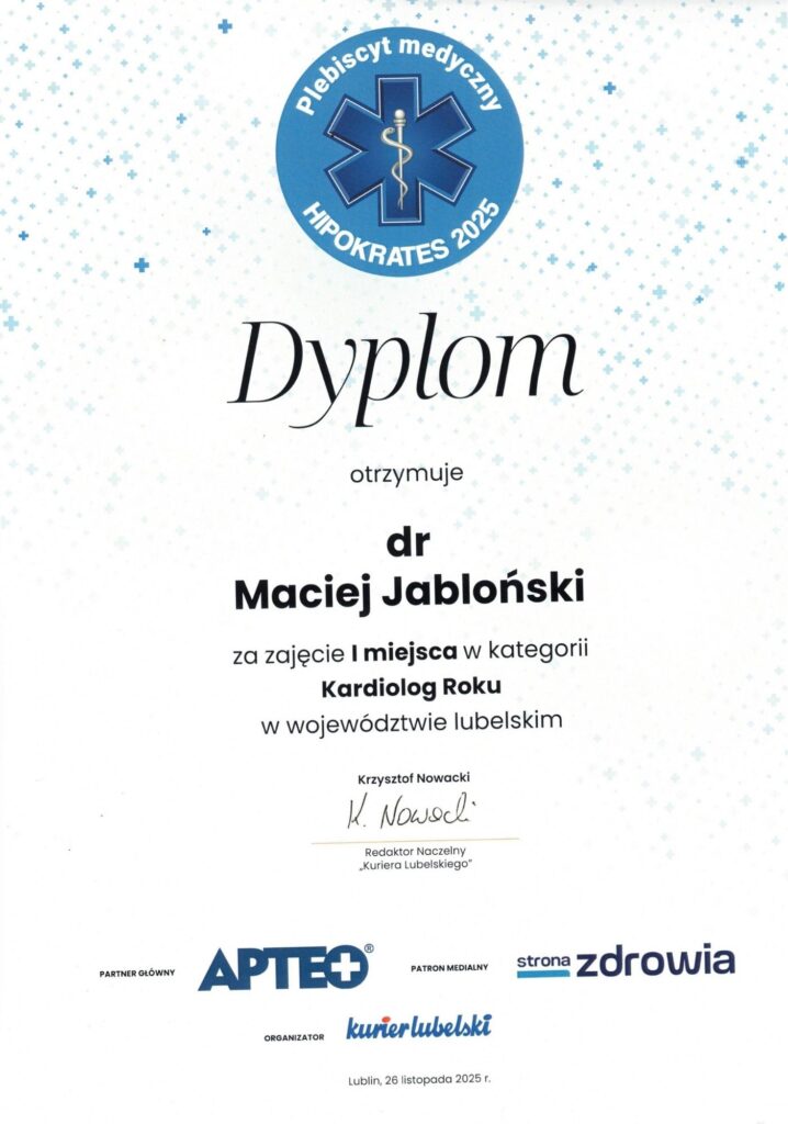 Z przyjemnością informujemy, że lek. Maciej Jabłoński zajął I miejsce w plebiscycie medycznym Hipokrates w kategorii Kardiolog Roku. Serdecznie gratulujemy.